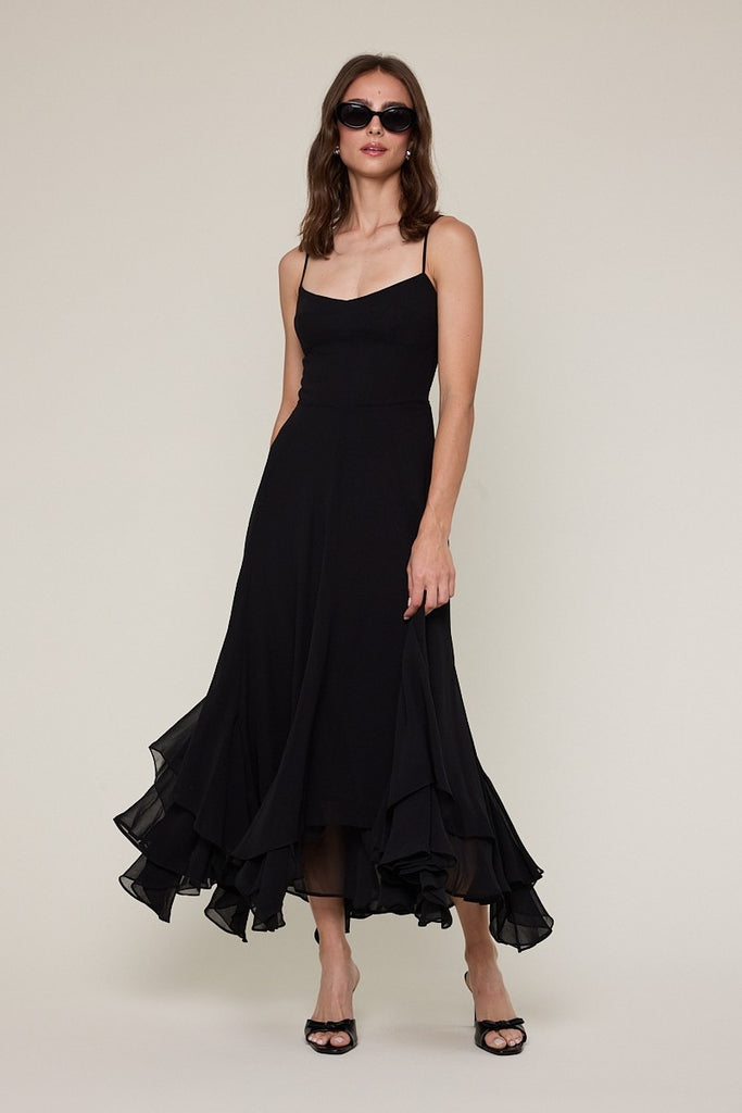 Step into elegance with the Noir Maxi Dress. Featuring an asymmetrical hem and playful ruffles, this dress moves beautifully with you. Adjustable straps and a discreet zipper back ensure a perfect fit, making it ideal for cocktail parties or weddings. The warm fall color adds a touch of seasonal charm to your wardrobe.